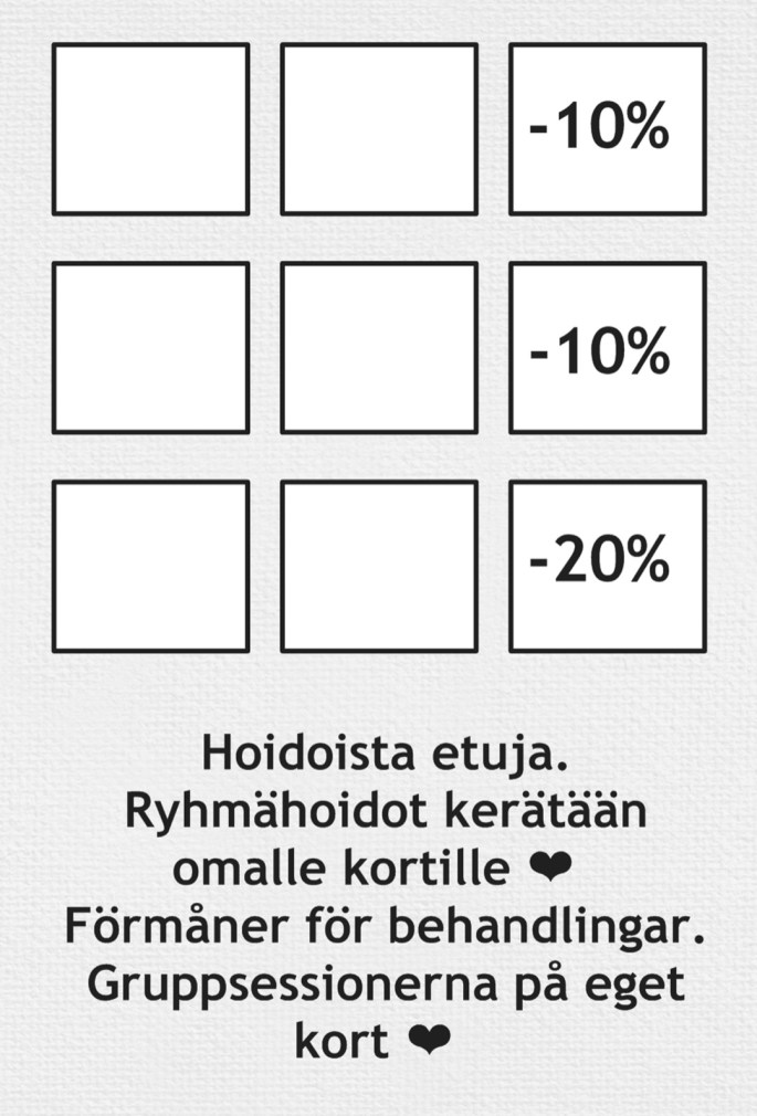 🇫🇮 Tiesitkö että voit kerätä hoitokertojasi keräilykortille, jolloin saat joka kolmannelle hoidolle alennusta? Yleinen suositus on vähintään kolme peräkkäistä hoitokertaa, jolloin hoito pääsee vaikuttamaan syvimpiin kerroksiin. Ryhmäsessiolle tulee olla oma kortti. Sydämellisesti Tervetuloa hoitoon! Varaa aikasi jo tänään.
