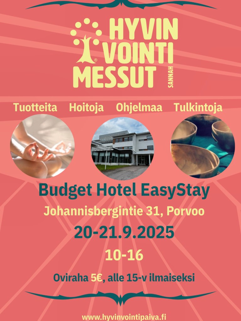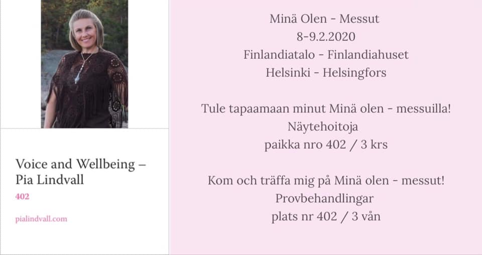 Lö 20. – Sö 21.9 klo 10-16 Hyvinvointimessut Porvoossa, Budget Hotel Easy, Johannisbergintie 31. Oviraha: 5€. Kom på workshop och ljudresa eller prova på Voice Healing vid mitt utställningsbord. Läs mera här:
