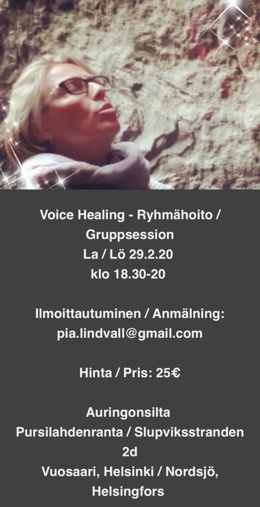 Lö 30.12 Kl 13-16 Frigör din röst – Workshop & Kl 17-19 Sound Healing Journey @ Heal Inn, Töckmovägen48c, Malax. I samarbete med Heal Inn och Artfactory Malakta. Anmäl dig senast 17.12 per e-post till healinn@malakta.fi