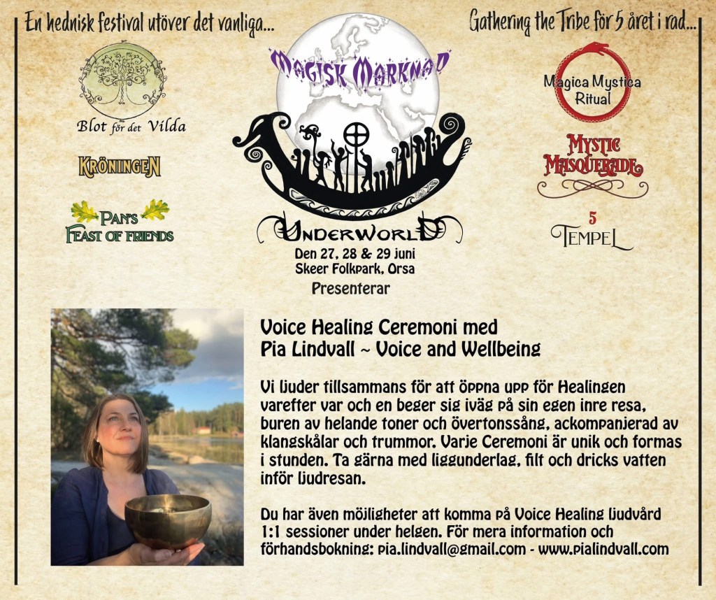 Röstens helande kraft – Workshop; Att ljuda på vokaler är djupt avslappnande, meditativt och ofta en upplyftande upplevelse som fördjupar kopplingen mellan ditt mentala och fysiska jag. I sångcirkeln ljuder vi tillsammans under ledning av Pia Lindvall, där röstens vårdande kraft stärks i form av ljudbad. Inga sångkunskaper krävs. Ta med egen vattenflaska. 45 min – Fri entré