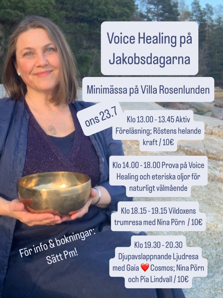 Lö 13.9 klo 10.30-12.30 Villa Rosenlunden, Jakobstad. Sångcirkel; helande toner – Vi ljuder tillsammans på vokaler och låter tonerna föra oss till ett djupt avslappnat och meditativt tillstånd, där våra sinnen finner ro och vi känner oss hela i kropp och själ. Vi avslutar med en valfri sharing-circle. Inga sångfärdigheter behövs. Ta gärna med en vattenflaska. Investering: 30€ när du anmäler dig senast 31.8 klo 23.59, därefter 35€. Anmälning och information