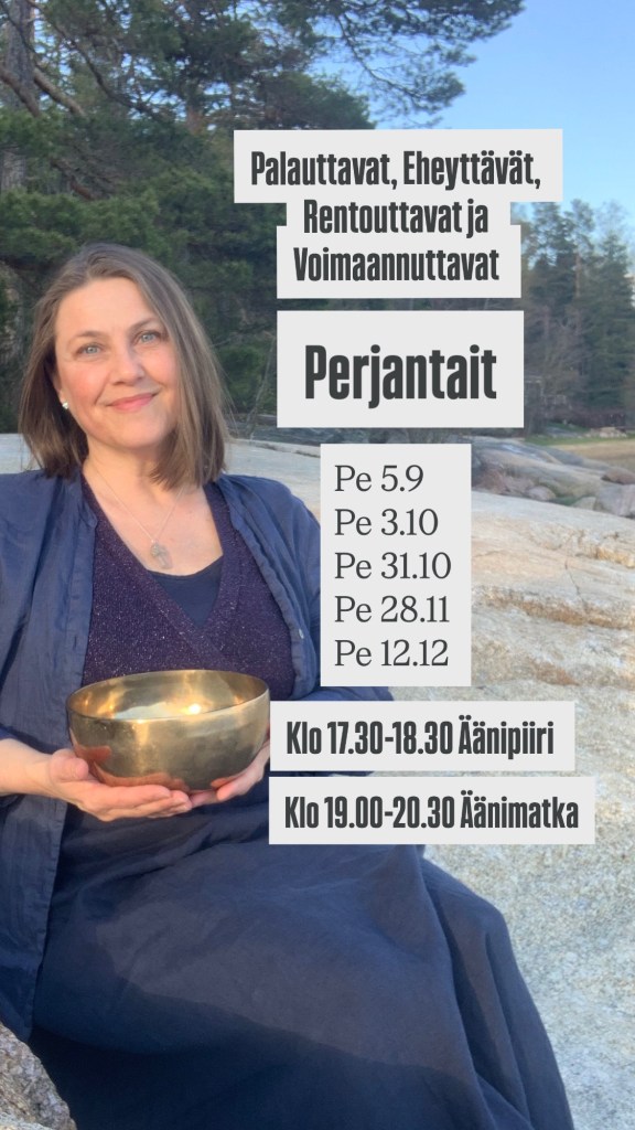 Pe 5.9 Kl 19.00 – 20.30 Ljudresa ~ Sound Healing Journey – Djupt avslappnande, helande och uppfriskande ljudvård. Ljudresan är intuitiv och skapas på ett ögonblick genom övertonssång, klangskålar och trummor. Investering: 30€ anmälning senast två veckor före evenemanget, 35€ efter det.